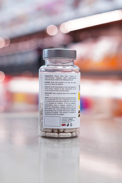 - 125µg (5000 IU) Vitamin D3 + 125µg Vitamin K2 per capsule
